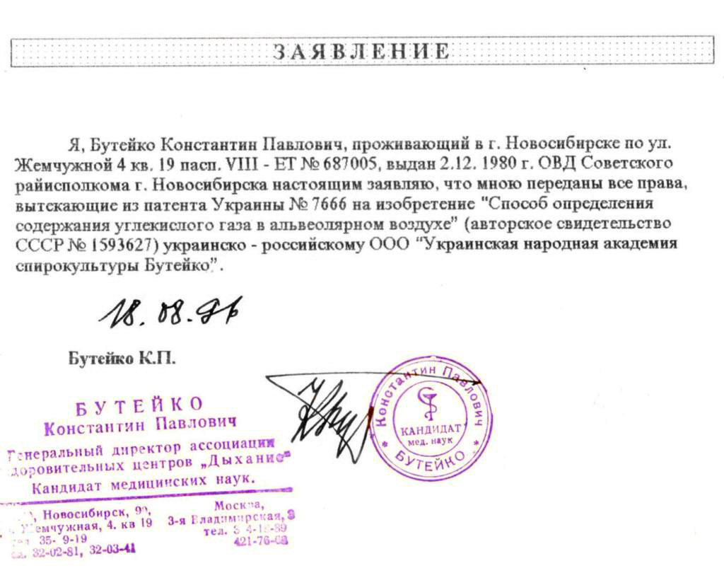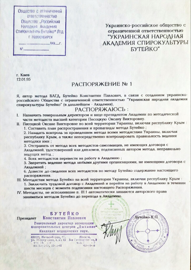 During K. Buteyko’s lifetime, I was a co‑founder (together with him) and director of the Ukrainian Buteyko Academy.